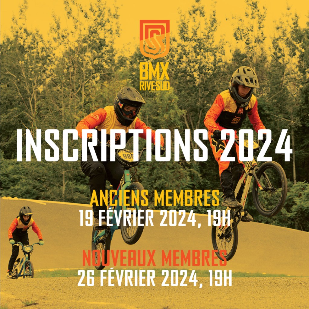 Le Club BMX Rive-Sud est ravi d’annoncer l’ouverture des inscriptions pour la saison 2024! Rejoignez notre communauté de passionnés de BMX. Les anciens membres pourront s’inscrire dès le 19 février 2024, à 19h, tandis que les nouveaux membres sont invités à s’inscrire à partir du 26 février 2024, à 19h.