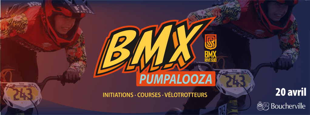 Le club de BMX Rive-Sud est heureux d’annoncer la tenue d’un nouvel événement, soit le Pumpalooza. Ce dernier se déroulera à la pumptrack et la piste de BMX de Boucherville le 20 avril prochain. Des courses chronométrées sur la pumptrack sont à l’horaire, tout comme une activité d’initiation au BMX.